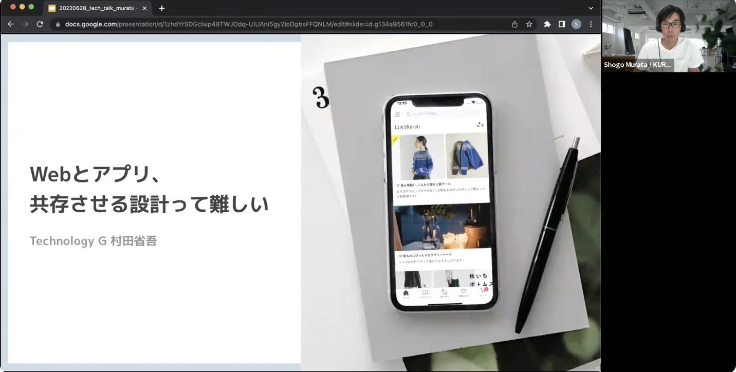 「北欧、暮らしの道具店」のスマホアプリは、2年で200万DLを突破し、EC購入率は約6割に達するほど多くの顧客に利用されるまでに成長いたしました。そこで今回、リリース2周年を記念して、初のエンジニアによるオンライントークイベント「Kurashicom Tech Talk」を2022年6月28日(火)に開催しました。テーマは「2年経った今だからこそわかる、開発課題の答え合わせ」。アプリ開発を担当したシニアエンジニアの廣瀬と、UI/UXデザイナー兼開発チームマネージャー村田の2名が登壇いたしました。