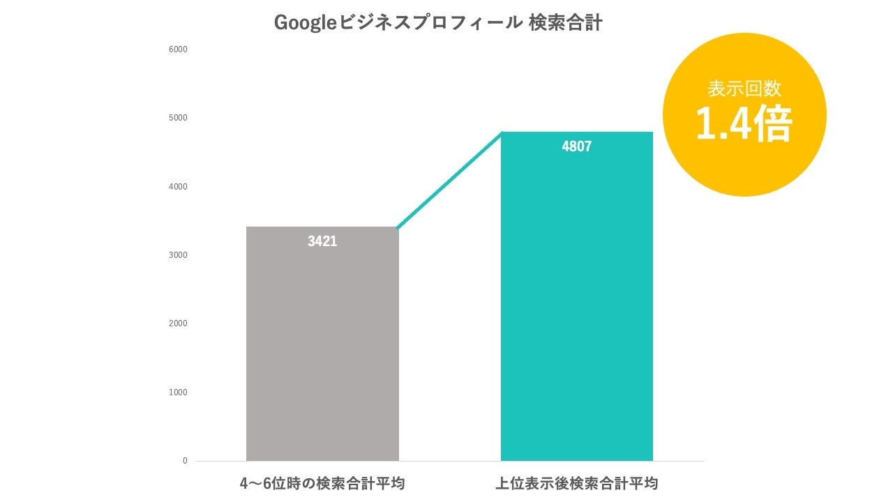 弊社が70店舗に対して行った調査では、「4位〜6位」から「1位〜3位」に変動することでGoogleビジネスプロフィールのマップ上での表示回数が約1.4倍になる結果となりました。