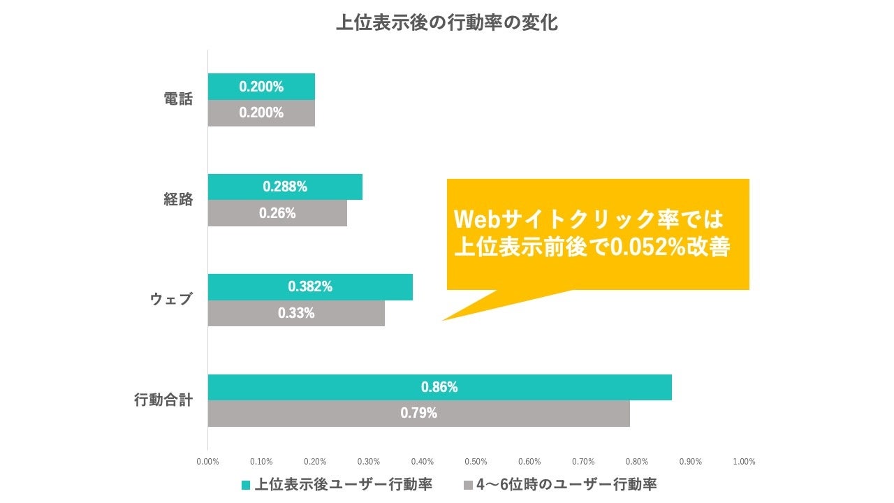 上位表示することでユーザーからの信頼度が若干上昇する結果となったが、表示回数やクリック率と比較すると大きな変化はなかったと言えます。