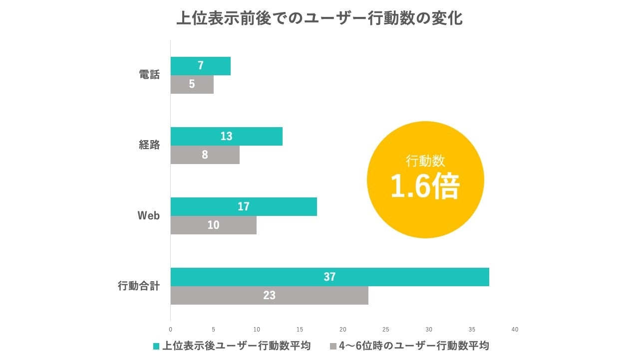 本調査では、下の表のように上位表示後の行動数が1.6倍に増加しており、多くのビジネスでMEO対策を行うことで店舗集客に好影響があると考えています。