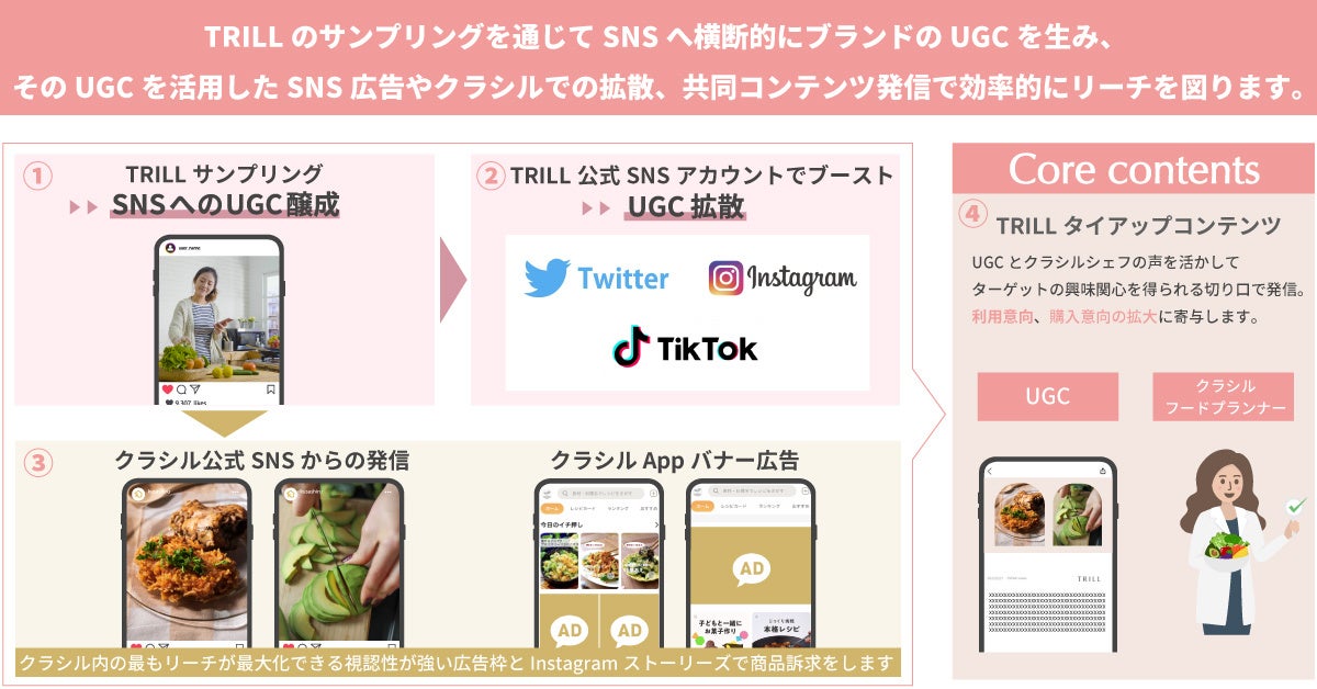 「TRILL」が運営するインフルエンサーネットワーク「TRILL mate」で実施するサンプリングでUGCを生成し、そのUGCを活用した広告を「TRILL」「クラシル」公式SNSで配信し、拡散を図ります。また、「クラシル」アプリ内での広告配信や「TRILL」内のタイアップコンテンツでも活用でき、通常のタイアップと比較してもリッチな広告メニューです。