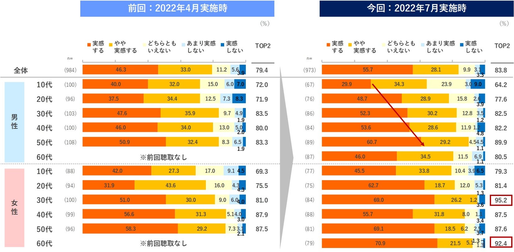 - 2022年7月はTOPBOXで5割強が「値上げを実感する」と回答。4月実施時と比べて1割程度上昇した。またTOP2では83.8%と4.4pts上昇。特に女性30代は95.2%と全性年代で最も高く、4月より+14.2pts。次いで女性60代が92.4%で続く。