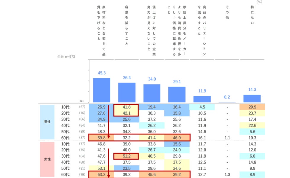 最近の円安・物価上昇を受けて、メーカー側にとってほしくないと思う対応を聴取しました。「原材料などを変えて品質を下げること」は、女性10代がやや高い数値ですが、男女とも年代が上がるにつれて増加する傾向が見られます。また、「容量を減らすこと」では、男性Z世代で全体より+5.4~5.7pts、女性30代で+14.8ptsと特に高い結果となりました。全体的に60代の反応が高い様子が窺えます。