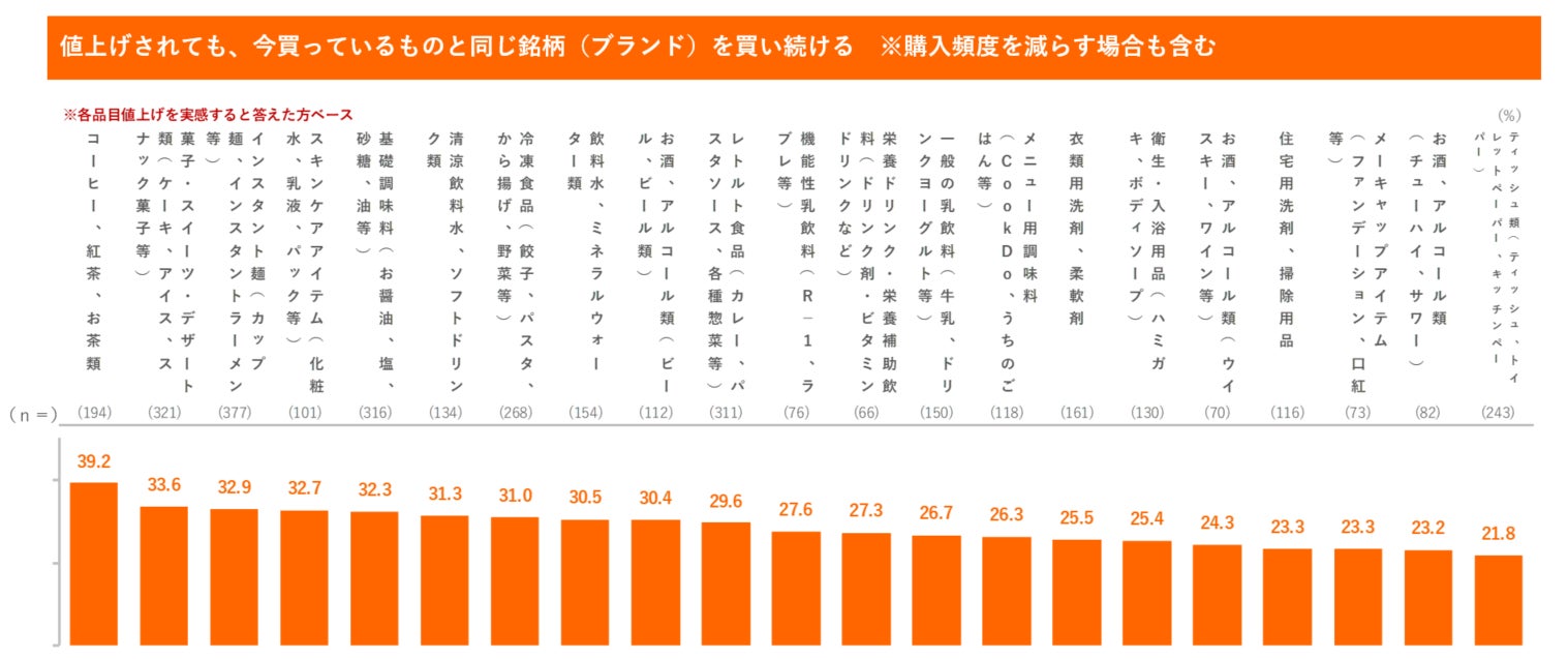 - 「値上げされても今と同じブランドを買い続ける」回答が最も多いカテゴリーは「コーヒー、紅茶、お茶類」で39.2%。次いで「菓子・スイーツ・デザート類」「インスタント麺」「スキンケアアイテム」「基礎調味料」と続く。アルコール類では、ビールは3割を超えた一方でRTDやウイスキー、ワインは2割強に留まった。