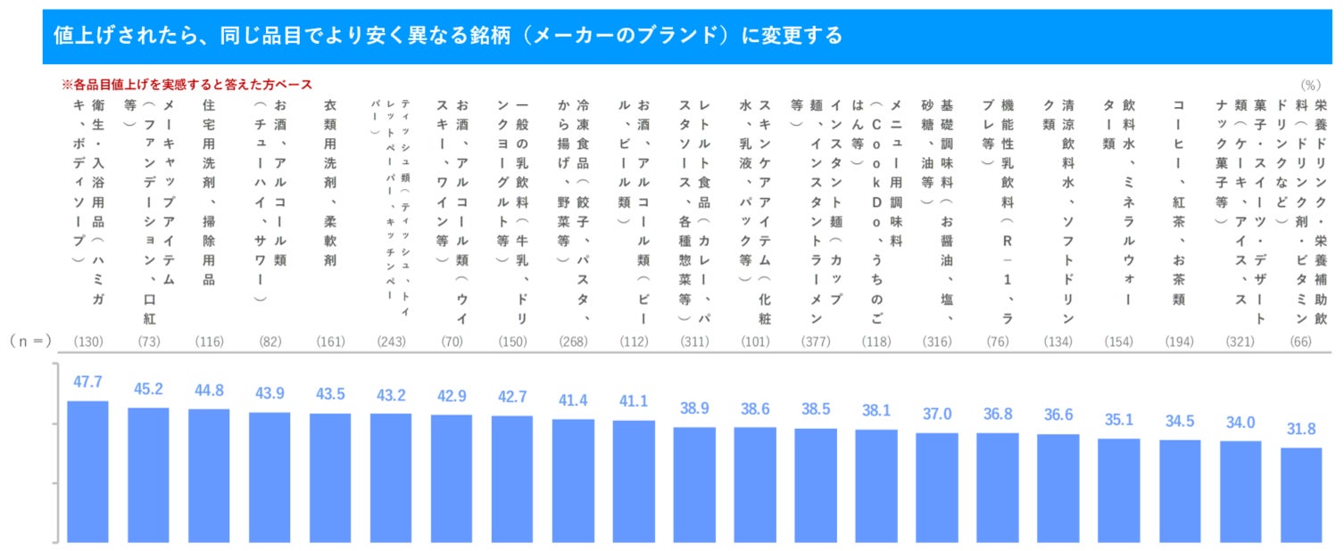 - 「値上げされたら、同じ品目でより安く異なる銘柄(メーカーのブランド)に変更する」回答が最も多いカテゴリーは「衛生・入浴用品」で47.7%と半数弱。次いで「メーキャップアイテム」「住宅用洗剤、掃除用品」と続く。メーキャップアイテムは、スキンケアアイテムに比べて、価格が他ブランドへのスイッチ要因になりやすい様子が窺える。