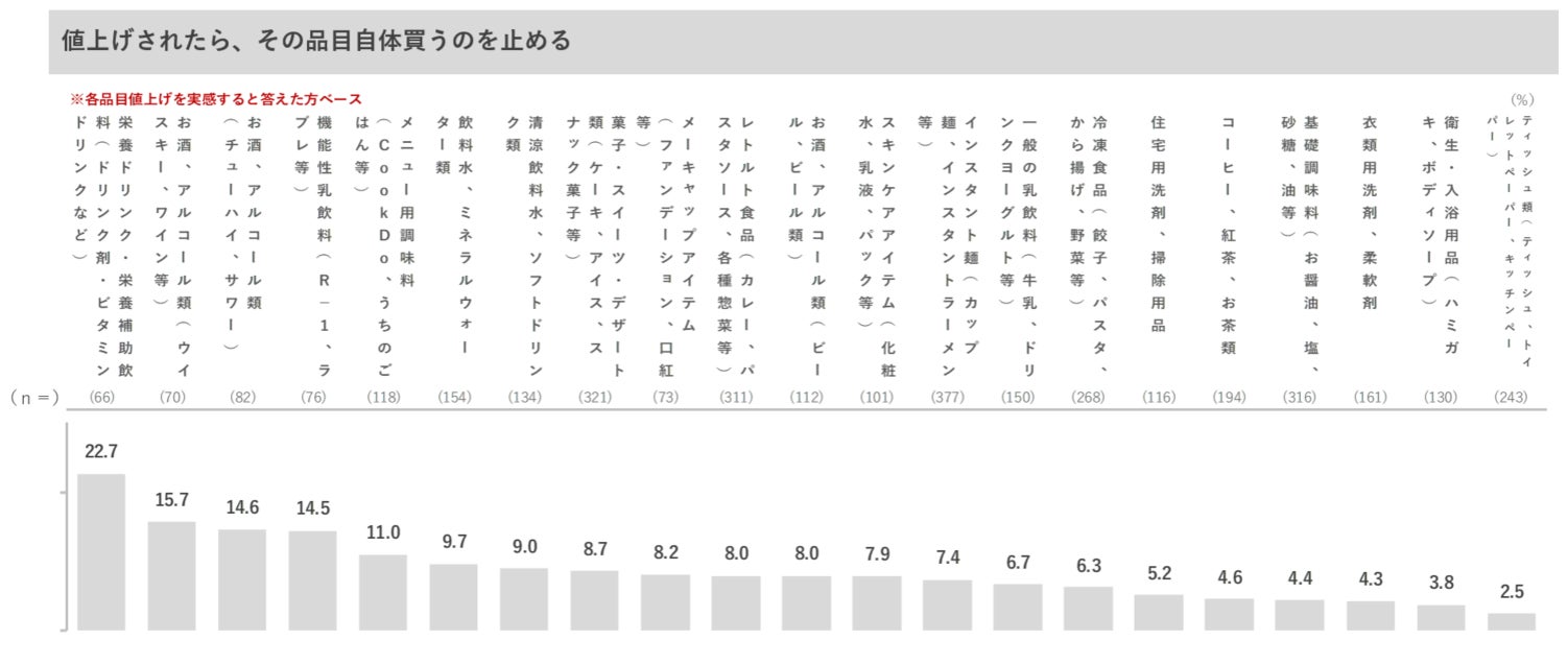 - 「値上げされたら、その品目自体買うのを止める」回答が最も多いカテゴリーは「栄養ドリンク・栄養補助飲料」で22.7%。次いで「お酒、アルコール類(ウイスキー、ワイン、RTD)」「機能性乳飲料」と続く。飲み物関連が上位に目立ち、他の品目と比べて価格の上昇が購入を止めることに繋がりやすい傾向。