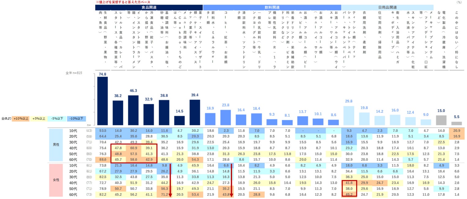 - 食品関連の値上げに実感が集中。特に「生鮮食品」が74.8%と突出、次いで「インスタント麺」46.3%、「菓子・スイーツ・デザート類」39.4%と続く。男女とも40代以上で実感する品目が全体より多い。また、日用品関連は、女性での実感が高い。