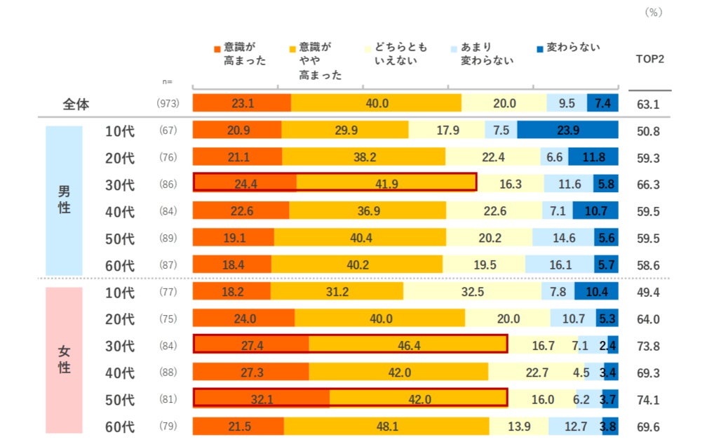 - TOP2が63.1%、半数以上が「節約意識が高まった」と回答。男女とも子育て世代の30代、および女性50代の7割が意識が高まったと回答。