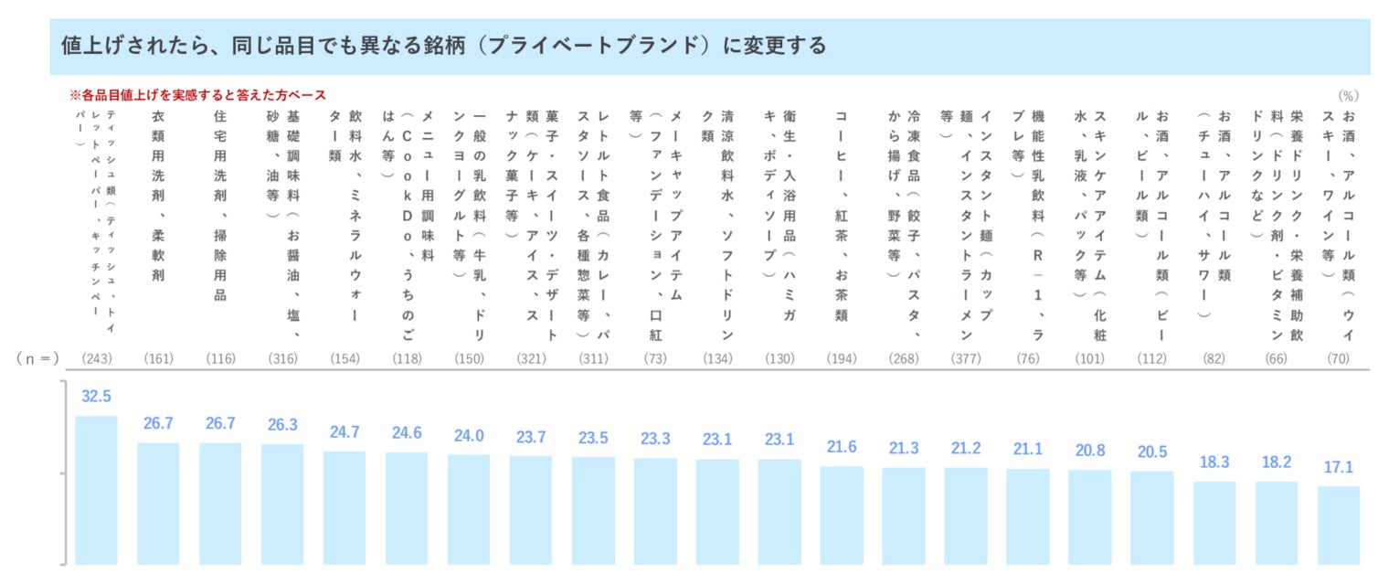 - 「値上げされたら、同じ品目でも異なる銘柄(プライベートブランド)に変更する」回答が最も多いカテゴリーは「ティッシュ類」で32.5%。次いで「衣類用洗剤、柔軟剤」「住宅用洗剤、掃除用品」「基礎調味料」の順。日用品関連がPBスイッチの上位に挙がりやすい傾向がみられる。