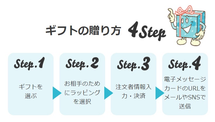 ご利用の基本的な流れは下記の通り。まず贈りたいギフトを選び、熨斗・ラッピング・電子メッセージカードを選択していきます。注文完了画面に表示されるギフトの受取URLをLINEなどでお相手へ送信すればお手続きは完了。
