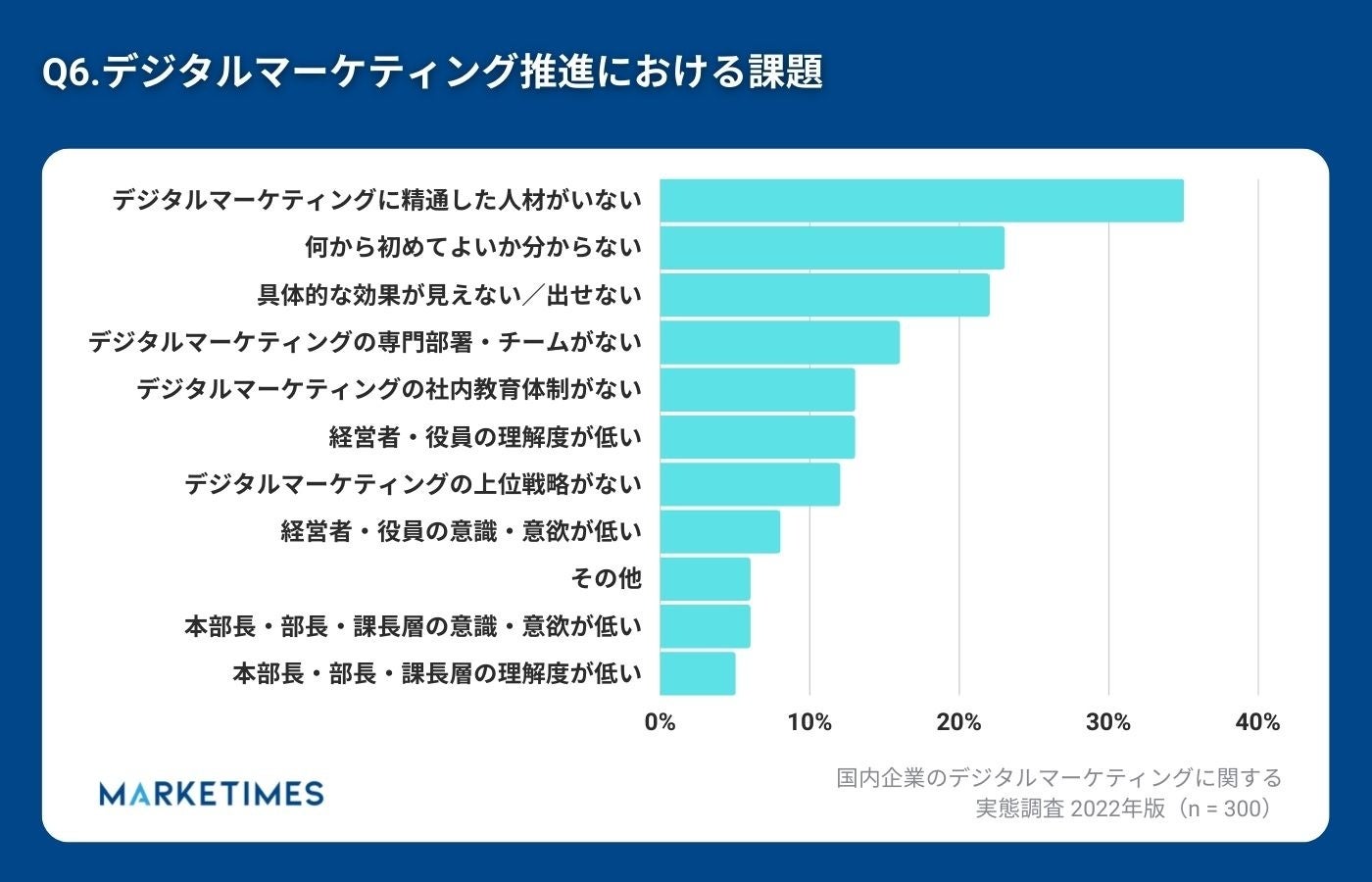 デジタルマーケティング推進における課題について質問(複数回答可)したところ、「デジタルマーケティングに精通した人材がいない」が「デジタルマーケティングに精通した人材がいない」がトップの35%次いで「何から初めてよいか分からない」が23%、「具体的な効果が見えない/出せない」が22%だった。