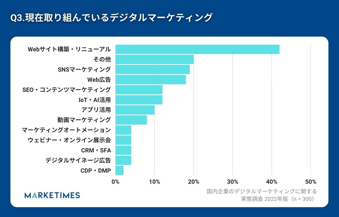 - 現在取り組んでいるデジタルマーケティングは「Webサイト構築・リニューアル」が最多の42%で、次いで「SNSマーケティング」「Web広告」と続く ※その他は除く