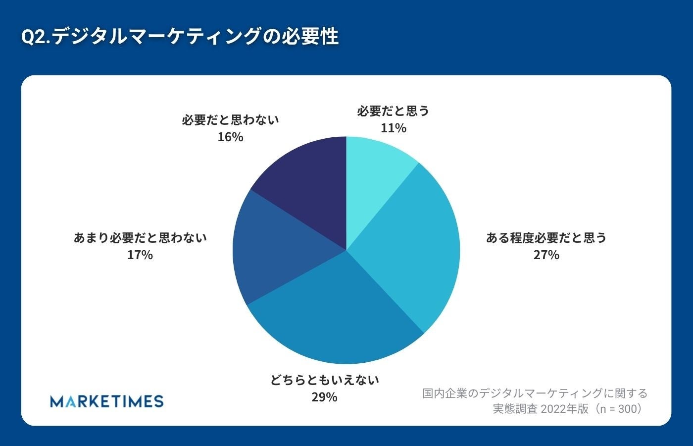 デジタルマーケティングの必要性について質問したところ「必要だと思う」「ある程度必要だと思う」で38%、「必要だと思わない」「あまり必要だと思わない」で33%、「どちらともいえない」という回答となった。