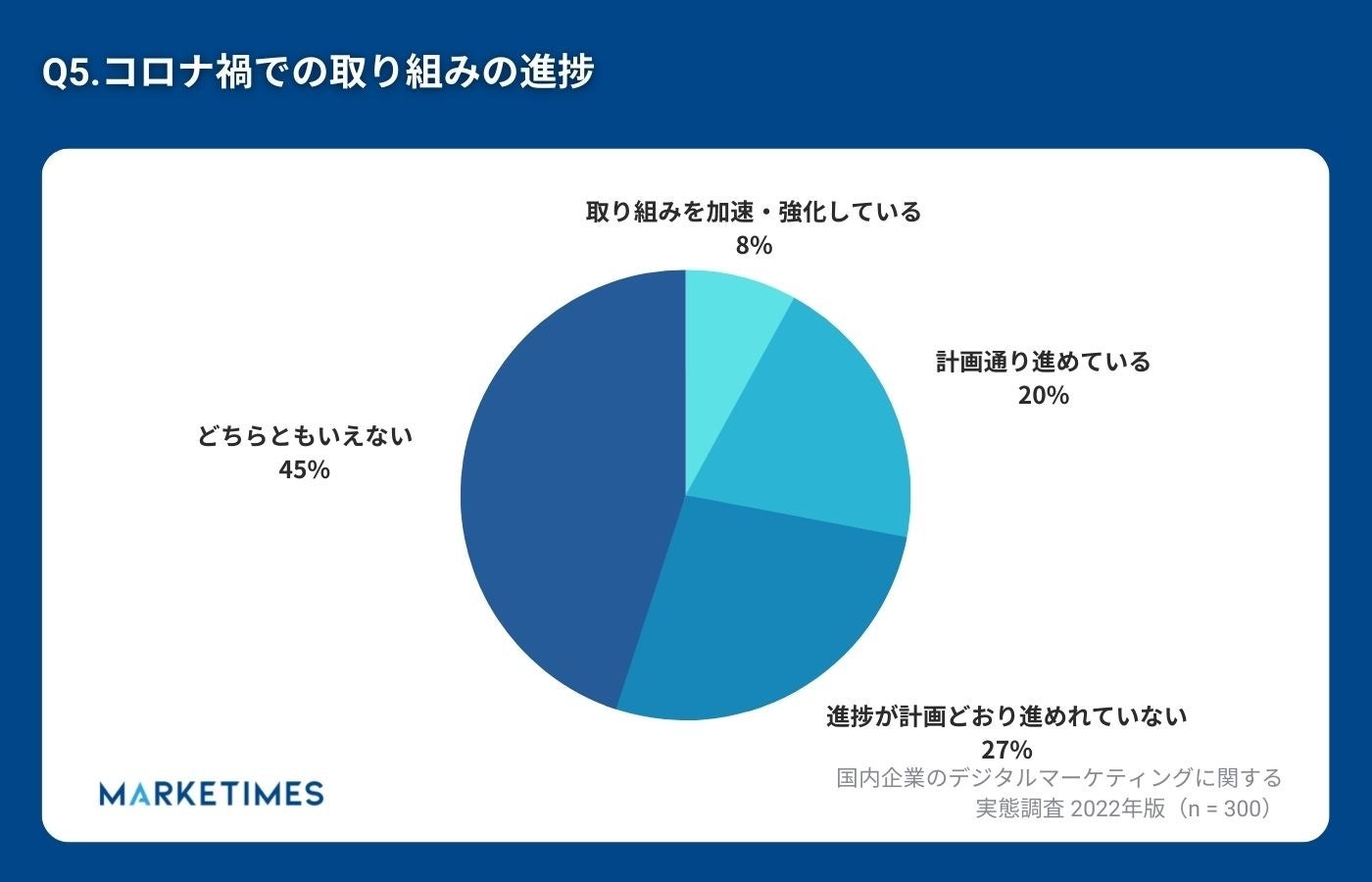 コロナ禍でのデジタルマーケティングの取り組みの進捗について質問したところ、「取り組みを加速・強化している」が8%、「計画通り進めている」が20%だった。「計画どおりに進めれていない」と感じる経営者・役員が全体の27%に及んだ。