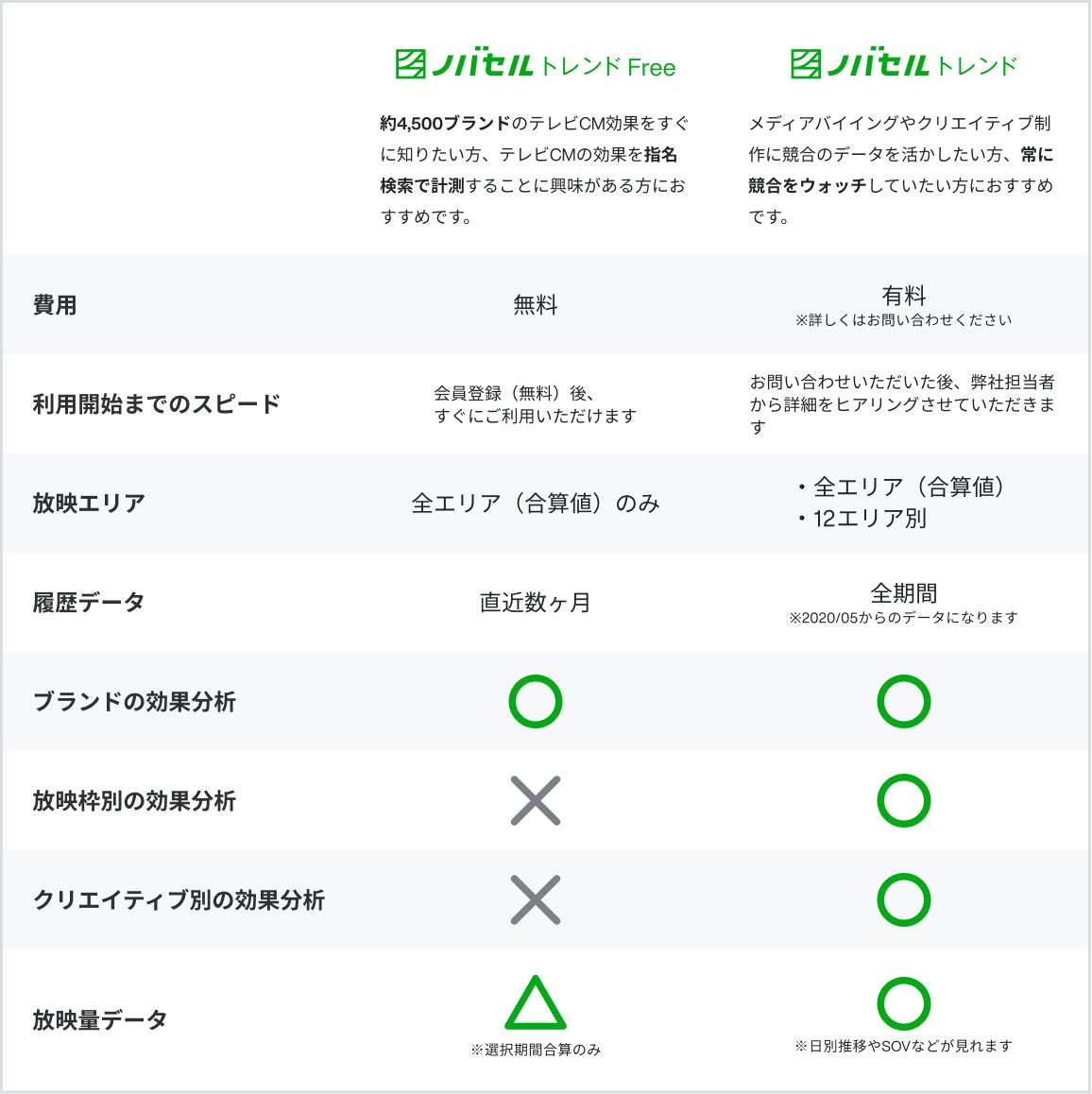 本サービスを提供する中で、テレビCMにおいてもwebと同様に「効果」で見て運用することが当たり前の世界をスピード感をもって創りたいという考えのもと、このたび「ノバセル トレンド」をフリーミアム化し、基本機能を無償化することにしました。