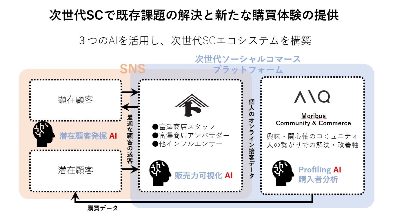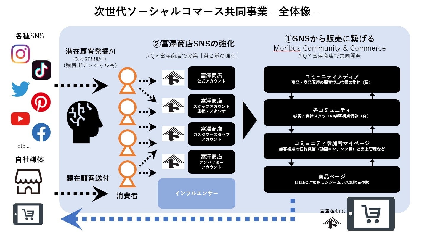 同社は、SNS上のユーザープロファイルを可視化できる特許取得済みのAI技術で、Instagram運用支援ツール「Moribus Navi」やインフルエンサーマーケティングツール「Moribus Casting」を開発・提供しています。また、個人で活動するインフルエンサーの経済的自立を支援するソーシャルコマースプラットフォームの構築も計画中です。AIQの技術は、商品知識が豊富な熱量の高い富澤商店の実店舗のスタッフや富澤商店の商品にまつわる共感力の高いSNSフォロワーをインフルエンサーのように活かせる親和性もあり、富澤商店が目指す「人同士のコミュニケーションで自然な販売に繋げるプラットフォーム」の開発に最適な相性だと確信し、提携に至りました。