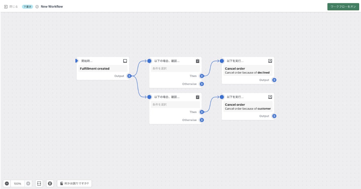 ShopifyFlowでのワークフロー設定イメージ。顧客のストア上の行動や、条件に従って、タスクを自動化することが可能です。