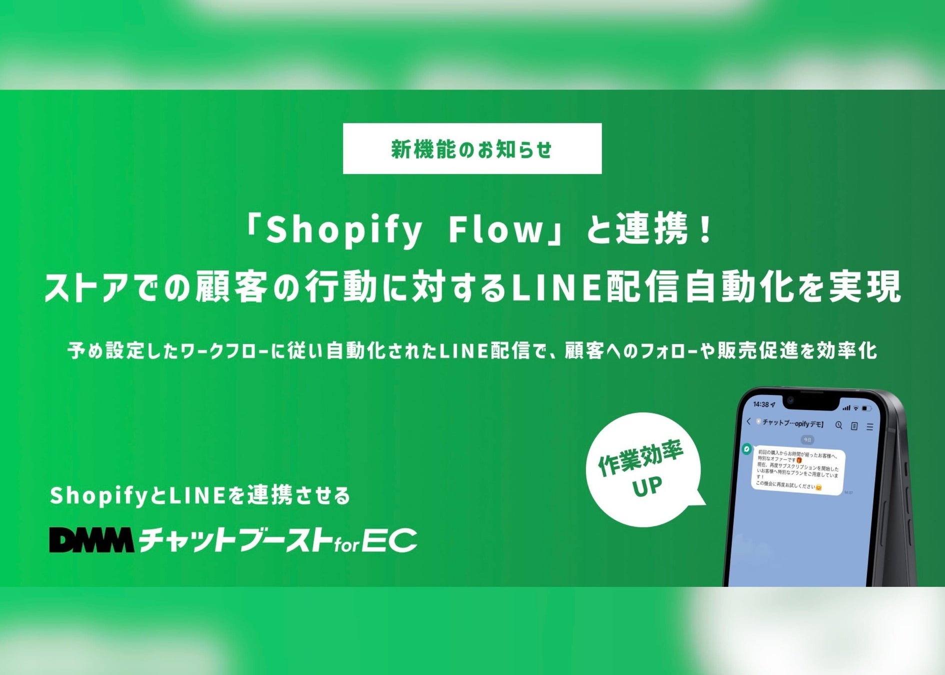 Shopify(ショッピファイ)とLINEを連携し、マーケティング成果を最大化させ、顧客対応の効率化を実現するShopifyアプリ「DMMチャットブースト for EC」(株式会社DMM Boost 本社:東京都港区、代表取締役社長:横関 秀樹)は、Shopifyアプリ「Shopify Flow」との連携が可能になりました。これにより、会員登録や購入、発送など、ShopifyFlowで用意された様々な顧客行動トリガーを起点とし、アクションとしてLINEでのメッセージ配信が設定できるようになります。