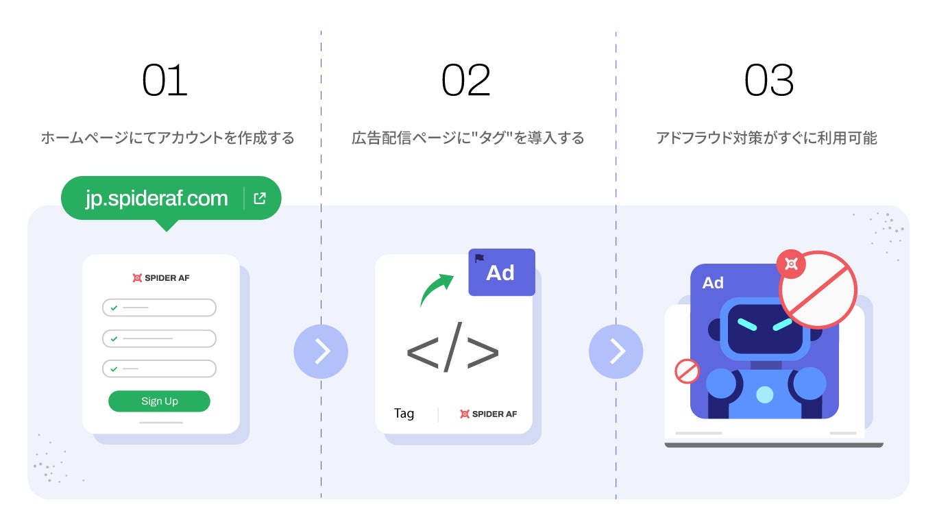 導入方法はとても簡単。ホームページ上より登録を行い、タグを発行することで最短5分でアドフラウド対策が可能となります。(https://jp.spideraf.com/sign-up )