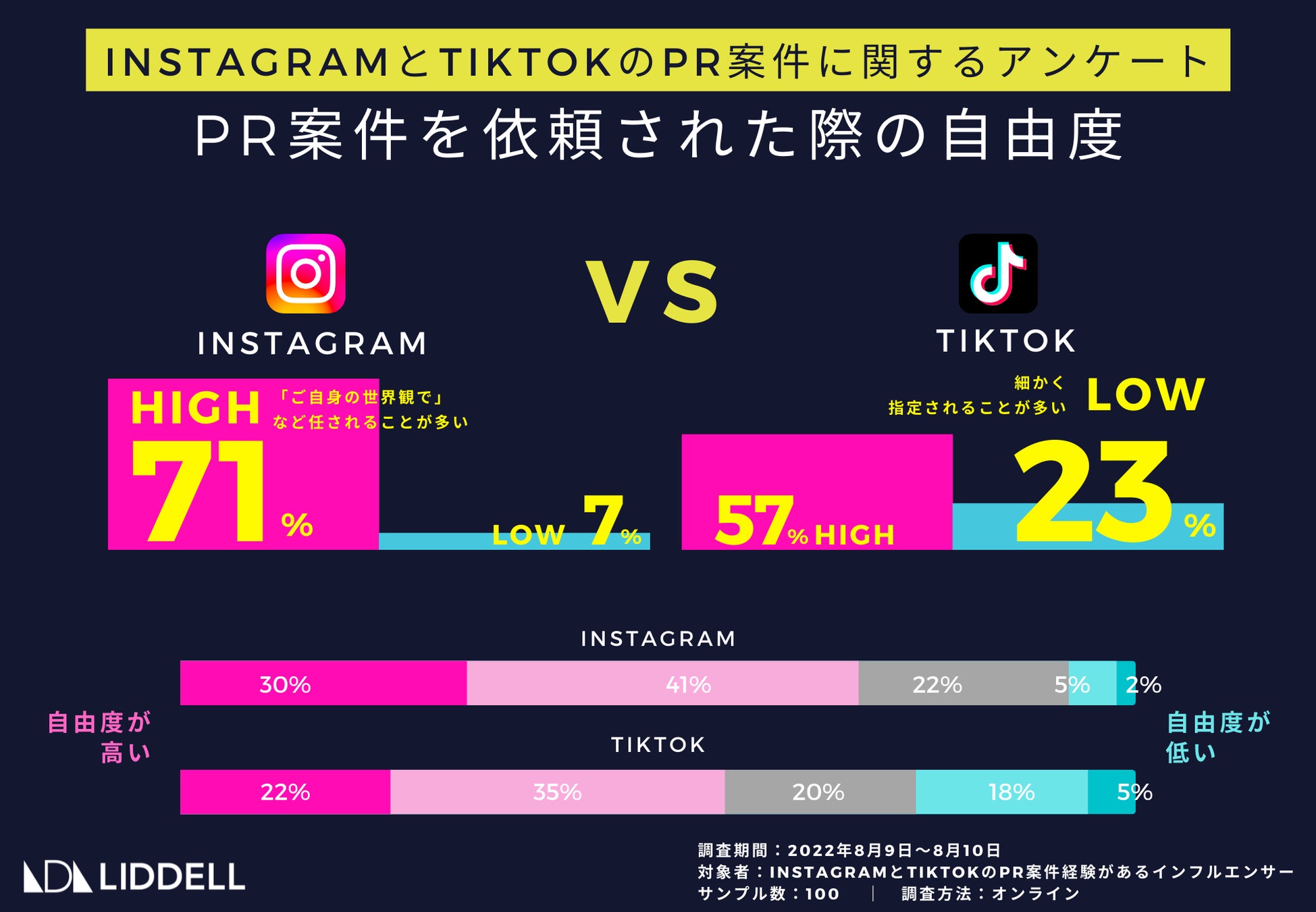 SNS・インフルエンサーマーケティング事業を展開するLIDDELL株式会社 (本社:東京都港区、代表取締役:福田 晃一、以下リデル) は、インフルエンサーを対象に、Instagram(インスタグラム )とTikTok(ティックトック)のPR案件に関するアンケートを実施致しました。