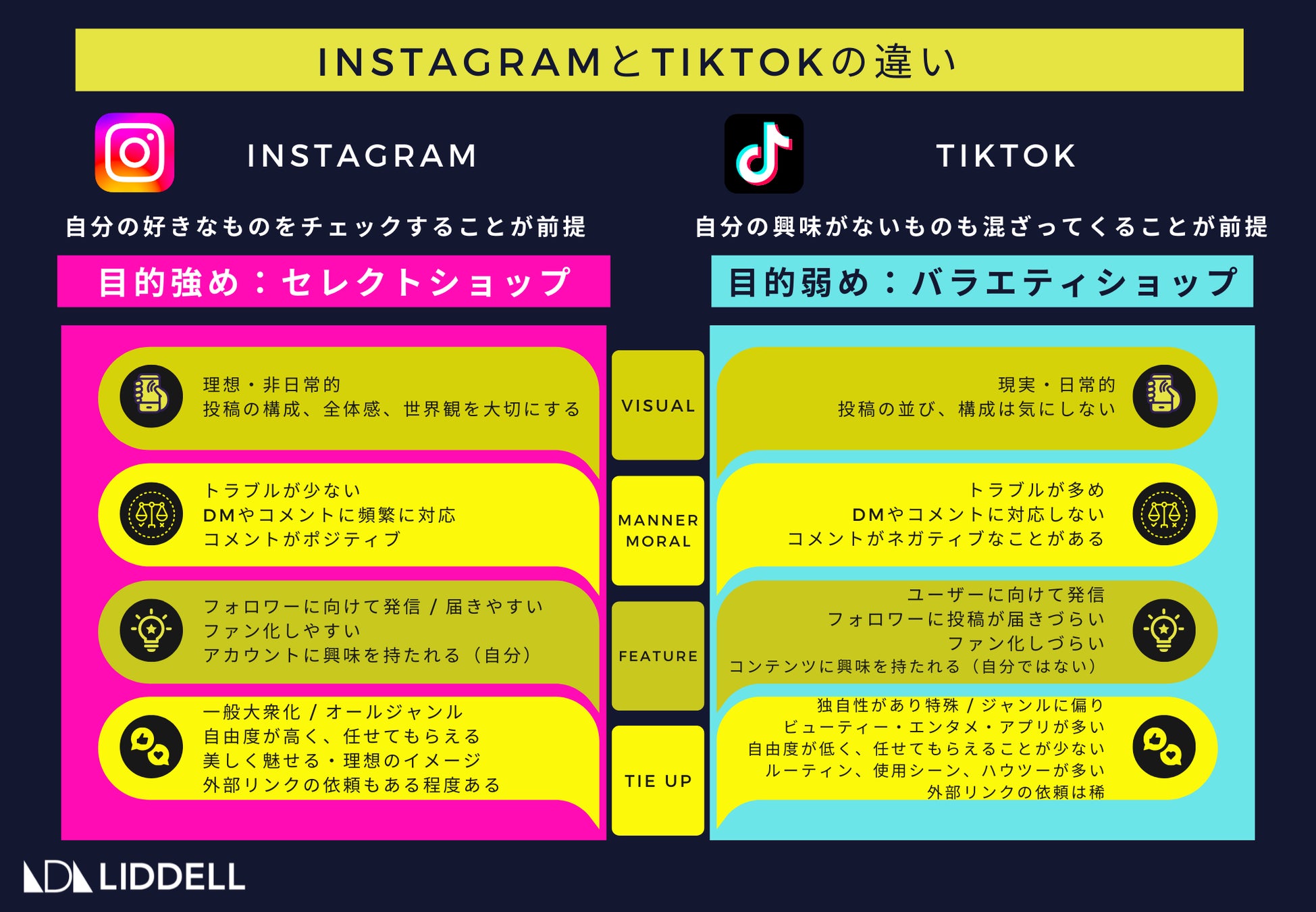 - Instagramは一般大衆化し、オールジャンル対応。TikTokは独自性があり特徴的、ジャンルに偏りがある。