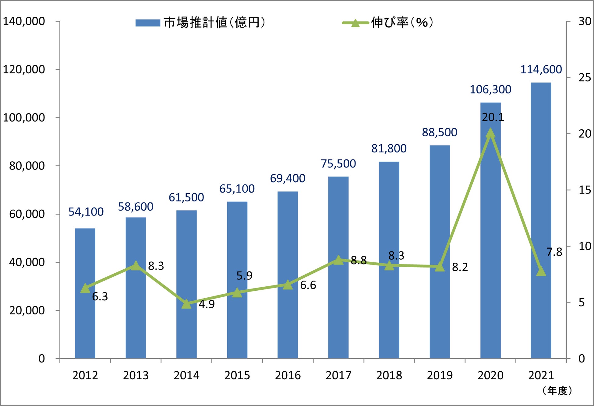 前年は、本調査開始以来初めて20%以上の伸び率となりましたが、2021年度は例年並みの7.8%の伸び率となりました。直近10年の平均成長率は8.5%と、マイナス成長を記録した1998年度以来、23年連続して増加傾向が続いています。