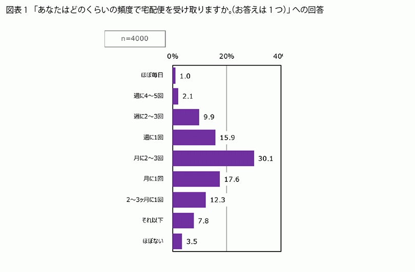 コロナ禍による「巣ごもり」でも脚光を浴びた宅配便。今回は宅配便の利用実態や意識を探ります。まず、どのくらいの頻度で宅配を受け取るかを聞いたところ(図表1)、最も割合が高かったのは「月に2〜3回」(30.1%)でした。次に高いのが「月に1回」(17.6%)、その次が「週に1回」(15.9%)です。月に1回以上の頻度で宅配便を受け取っている人は合計で76.4%と、8割に迫る割合です。