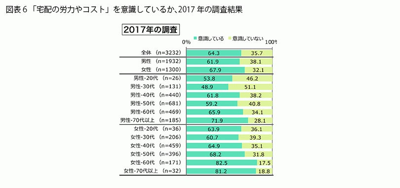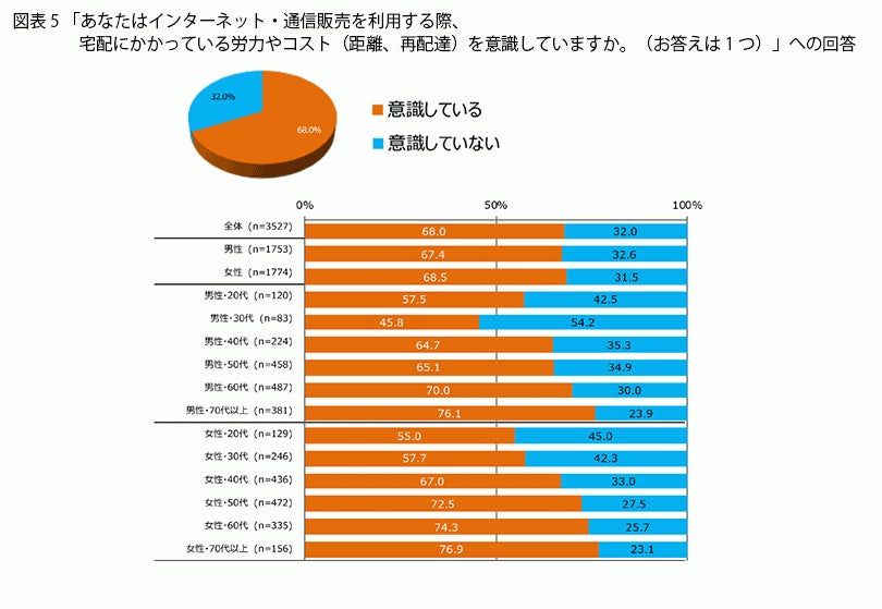 インターネット・通信販売を利用する際、宅配にかかっている労力やコストを意識しているかを聞くと(図表5)、「意識している」と回答した人は68.0%でした。