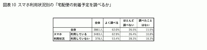 「スマホを利用しているかいないか」が、「到着予定を知らべるかどうか」と関係があるか見てみると(図表10)、スマホを利用している人の「よく調べる」割合は62.9%で、スマホを利用していない人と比べると、9.5ポイントの差がありました。確かに差はあるものの、そこまで大きくはありません。