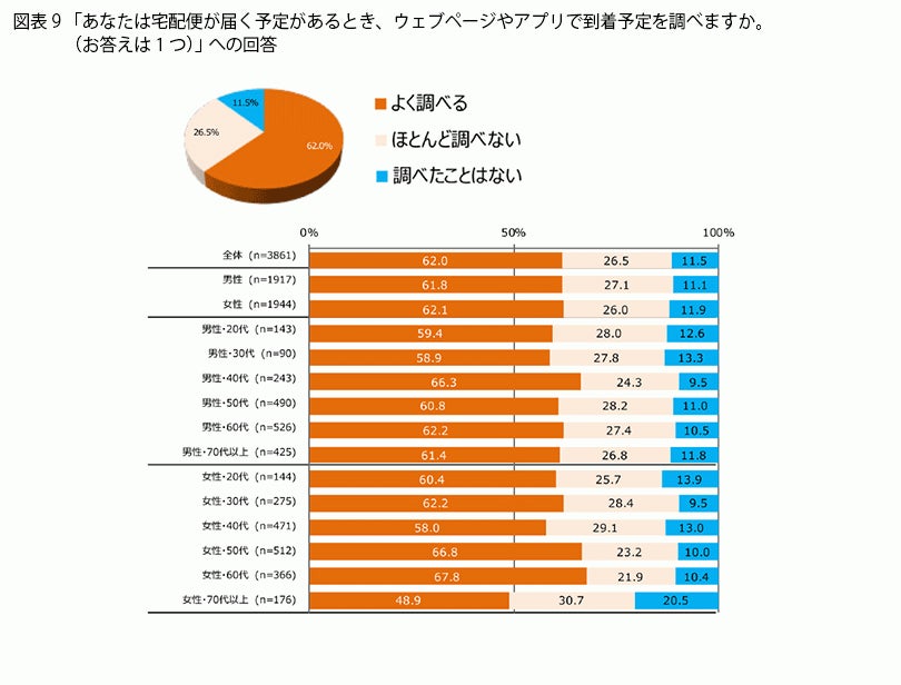 宅配便が届く予定があるとき、ウェブページやアプリで到着予定を調べるかを聞くと(図表9)、「よく調べる」と回答した人が62.0%いた一方で、「調べたことはない」という人が11.5%いました。