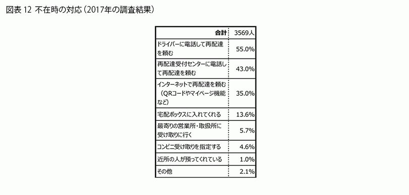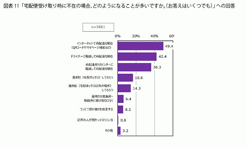 宅配便受け取り時に不在の場合、どのようになることが多いかを聞くと(図表11)、最も多かったのは「インターネットで再配達を頼む(QRコードやマイページ機能など)」(49.4%)でした。その次は「ドライバーに電話して再配達を頼む」(42.4%)、「再配達受付センターに電話して再配達を頼む」(36.3%)と続きます。