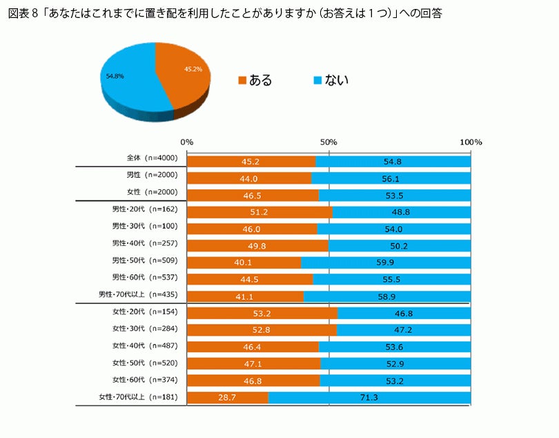 また、「置き配」(荷物を対面で手渡すのではなく、指定された場所に置いておくサービス)を利用したことがあるかを聞くと(図表8)、全体では45.2%の人が「ある」と回答しました。若い世代のほうが置き配の利用経験が高い傾向があり、「70代以上」を除くと、女性のほうが割合が高いです。また、置き配の利用経験がある人は宅配のコストを意識している人が74.6%、利用経験がない人は62.0%でした。こちらのほうは、10ポイント以上の差がついています。