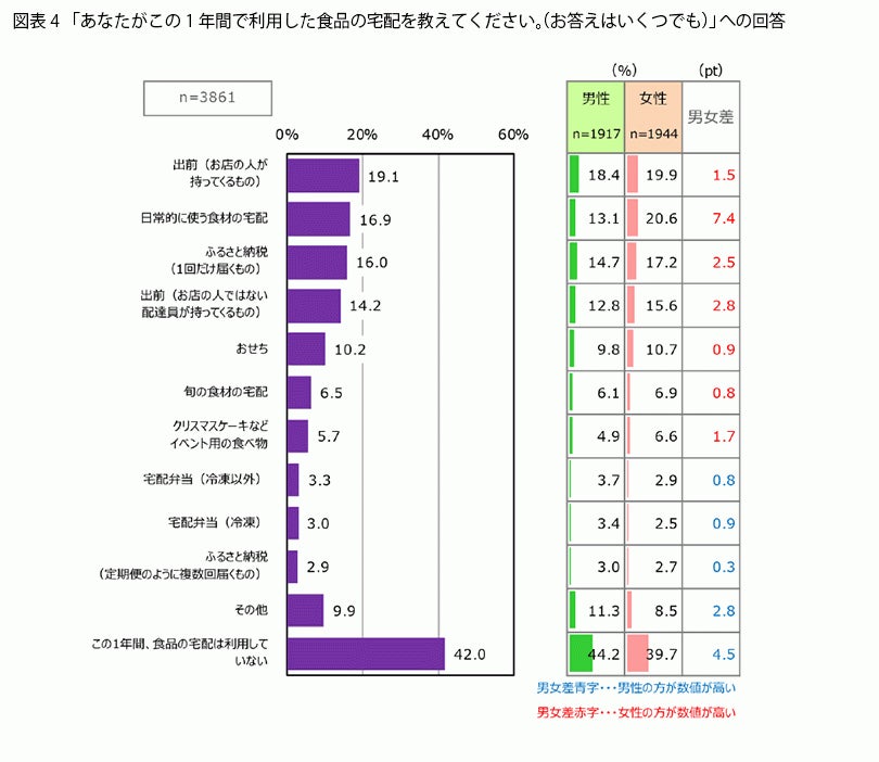 宅配のなかでも食品に絞って聞いたところ(図表4)、最も多かったのは「出前(お店の人が持ってくるもの)」(19.1%)でしたが、「日常的に使う食材の宅配」(16.9%)、「ふるさと納税(1回だけ届くもの)」(16.0%)、「出前(お店の人ではない配達員が持ってくるもの)」(14.2%)も、あまり差がありません。