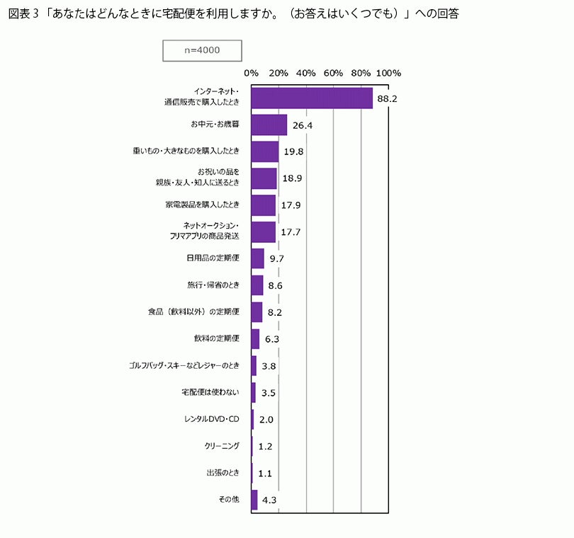 これだけネット通販が浸透していることもあって、宅配便を利用するシーン(図表3)でも、「インターネット・通信販売で購入したとき」(88.2%)がダントツで高くなっています。ただ、単なるプライベートな利用だけでなく、「お中元・お歳暮」(26.4%)、「お祝いの品を親族・友人・知人に送るとき」(18.9%)といった、贈答目的の利用も高い割合です。