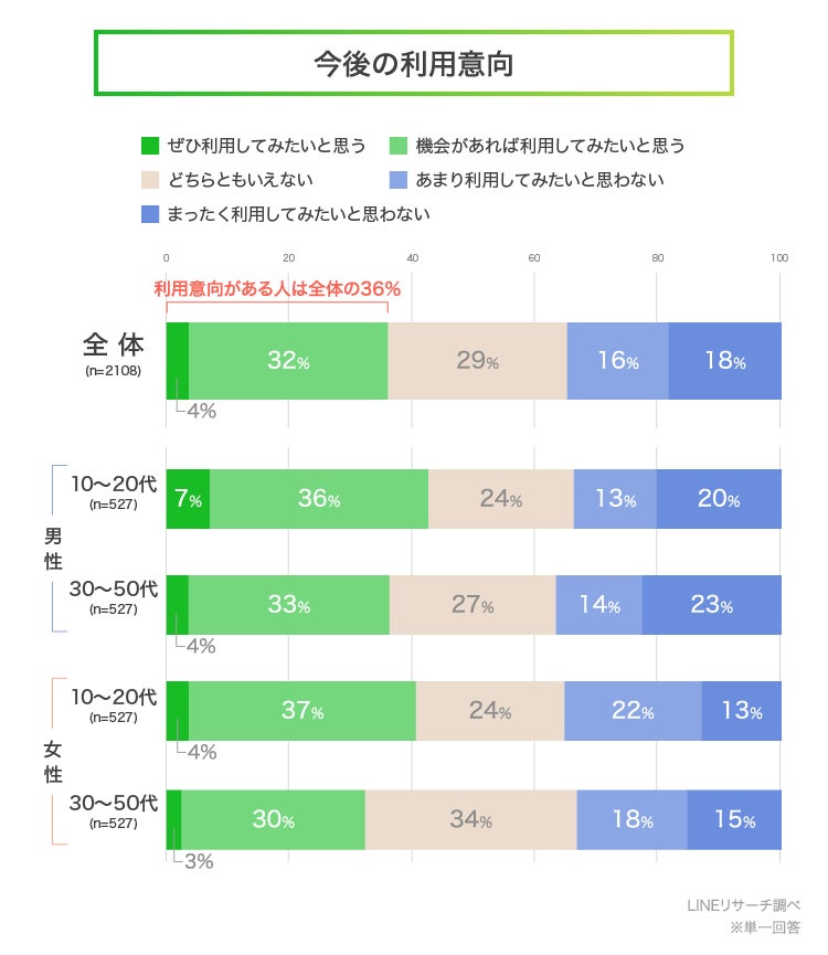 次に、今後の利用の意向について回答してもらったところ、利用意向がある人の割合(「ぜひ利用してみたいと思う」「機会があれば利用してみたいと思う」の合計)は全体で36%でした。
