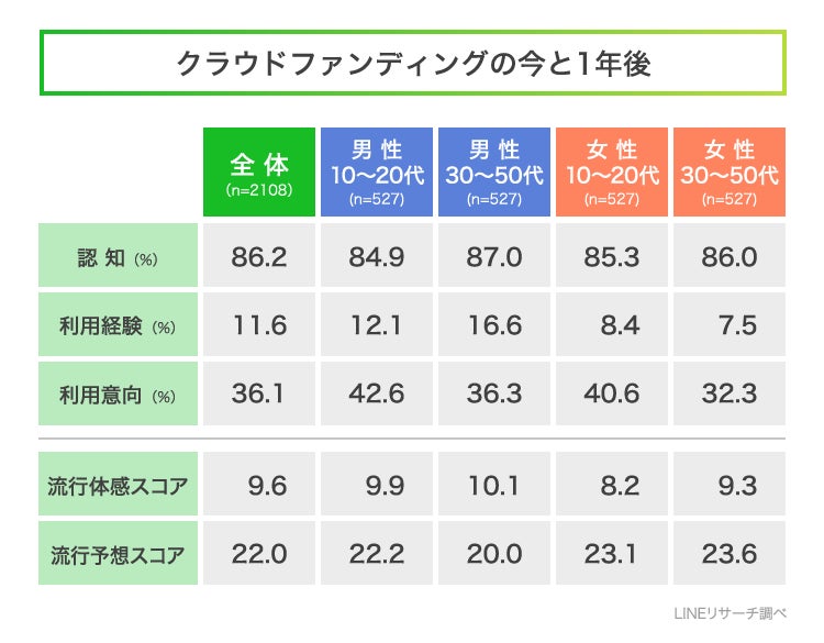 その結果、「クラウドファンディング」の流行体感スコアは全体で「9.6」で、およそ10人に1人が利用しているイメージです。年代別、男女別にみても大きな差はありませんでした。