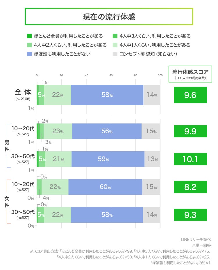流行体感としては、全体で“およそ10人に1人が利用している”イメージを持たれているようです。そして、今から1年後には、現在の約2倍の“5人に1人ぐらいが利用しそう”というイメージを持たれています。