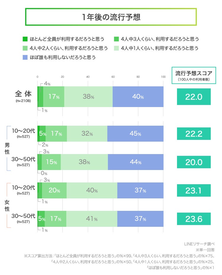 次に、「1年後、自分のまわりでどのくらいの人が利用していると思うか」を想像して答えてもらいました。グラフにある流行予想スコアは、100人中どのくらいの人が1年後に利用していそうかを算出した数値です。