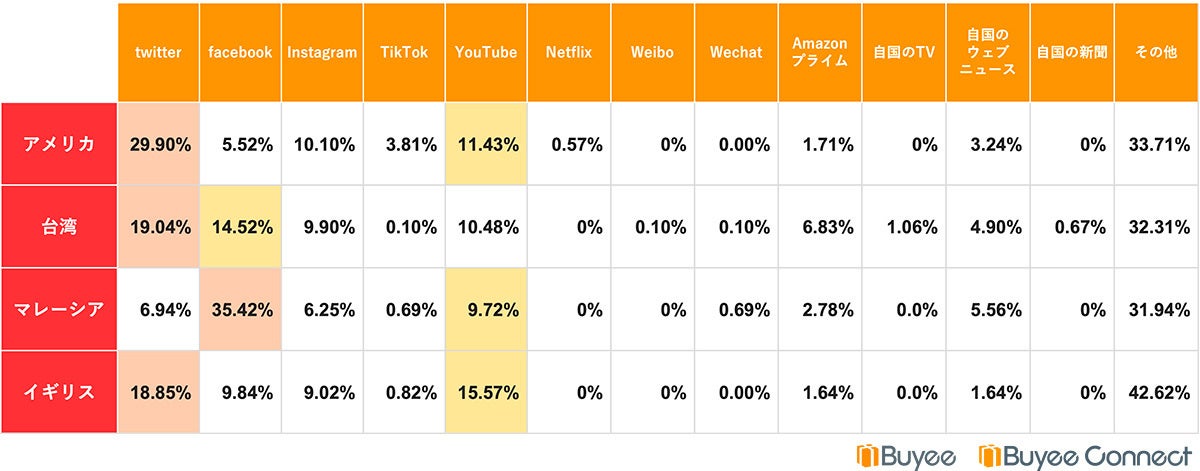 「日本の製品を購入する際に、参考にしている情報があれば教えてください。」(単一回答)という質問に対してアメリカ(29.9%)、台湾(19%)、イギリス(18.9%)はtwitter、マレーシア(35.4%)はfacebookが最も多い結果となりました。