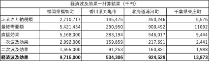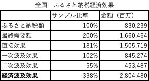 ふるさと納税制度を要因として発生した経済活動は、①個人から自治体への寄付、②自治体から寄付者への返礼、③寄付を受けた自治体による寄付金使途です。よって「ふるさと納税額」の2倍が「最終需要額」となっています。「直接効果」は国内自給率などで換算した数位、これに一次波及と二次波及を加えて、経済波及効果といます。