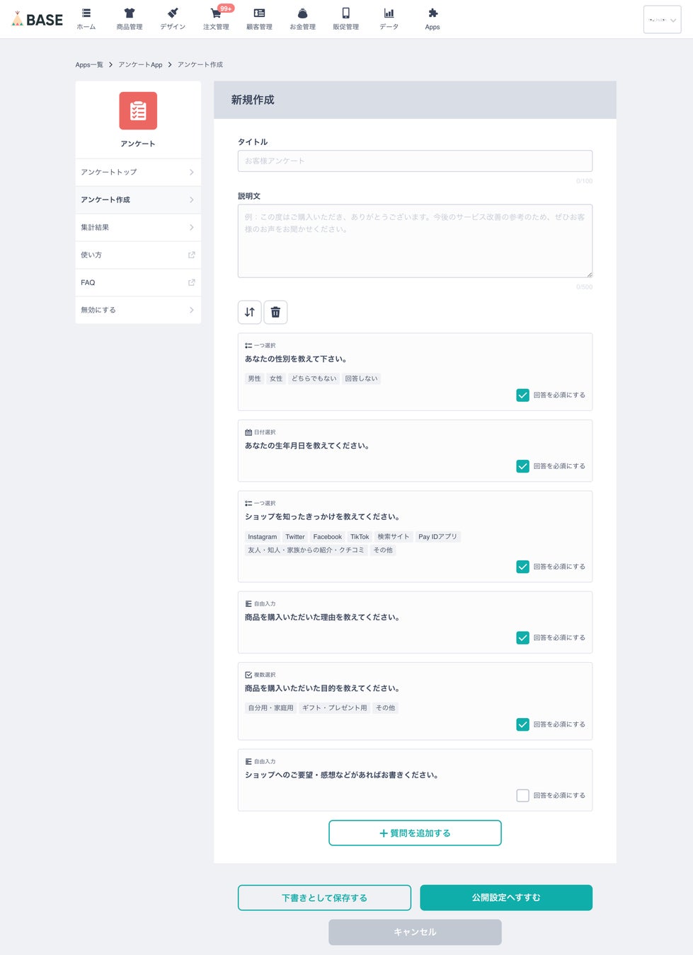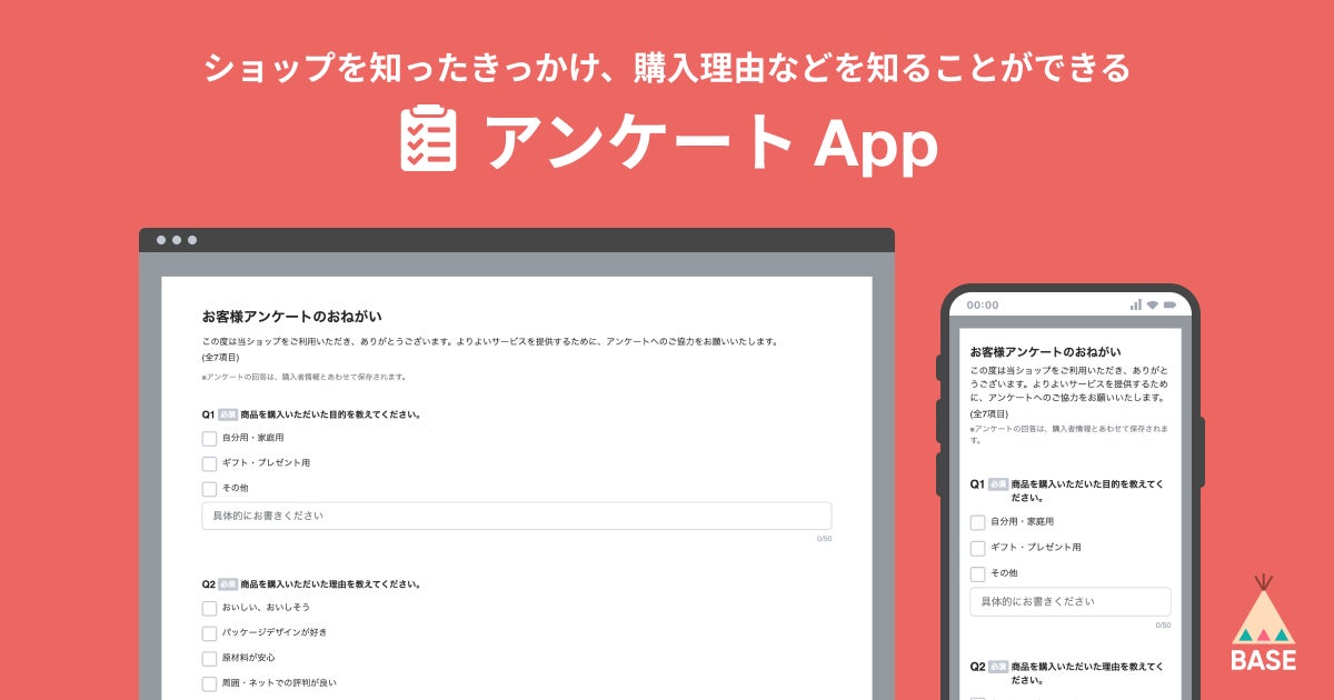 この度、BASE株式会社(所在地:東京都港区、代表取締役CEO:鶴岡 裕太)が運営するネットショップ作成サービス「BASE(ベイス)」は、「BASE」をご利用のネットショップが購入者にアンケートを実施できる拡張機能「アンケート App」の提供を2022年8月31日(水)より開始したことをお知らせいたします。