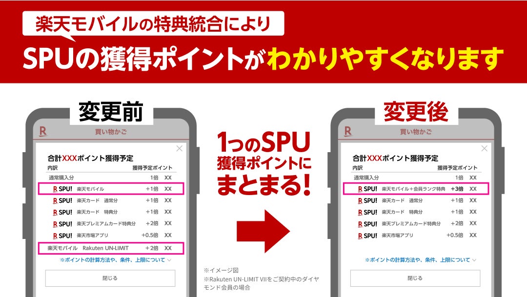 これまで本キャンペーンのポイント付与はお買い物月の翌月末に実施していましたが、今後は「SPU」としてお買い物月の翌月15日にポイント付与を実施します。また、特典の統合に伴う上限ポイントの変更により、「楽天市場」で一定金額のお買い物をするお客様は、以前よりポイントを多く獲得することができます(注5)。さらに、「楽天市場」でお買い物する際に表示される獲得予定のポイントについて、「SPU」による獲得としてポイントをまとめて表示することで、お客様は、ポイントの内訳をわかりやすく確認できるようになります。