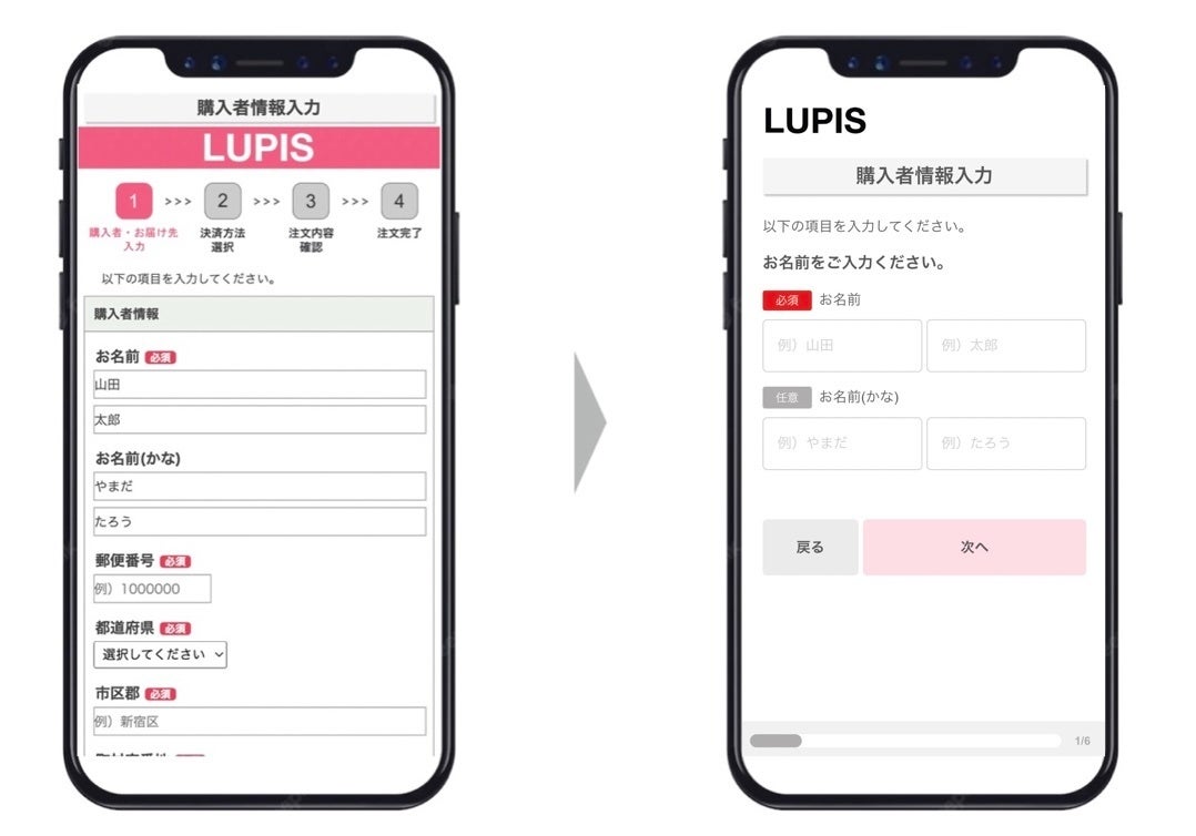 これらの個人情報入力画面の項目を1問ずつ表示するステップ型のUIに変更することで、スマートフォンユーザーのフォーム入力におけるストレスを軽減し、コンバージョンを向上させます。
