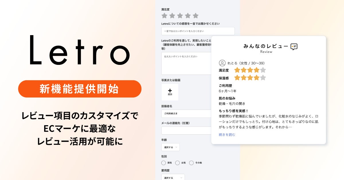 企業のマーケティングDXを支援するアライドアーキテクツ株式会社(東京都渋谷区、代表取締役社長 CEO:中村壮秀、プロダクトカンパニー プレジデント:村岡弥真人、証券コード:6081)が提供する運用型UGC(※1)ソリューション「Letro(レトロ)」は、ユーザーの詳細なレビューの収集から掲載までを行うための新機能として「レビュー項目設定機能」の提供を開始しましたのでお知らせいたします。