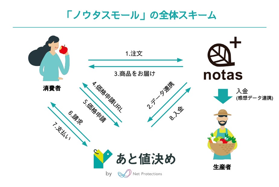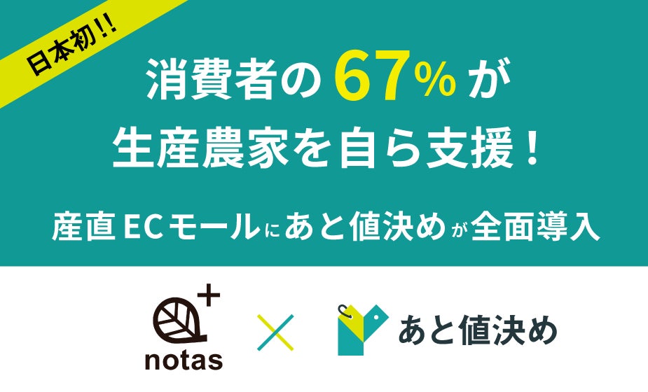 株式会社ネットプロテクションズ(所在地:東京都千代田区、代表取締役社長:柴田 紳、以下当社)は、ノウタス株式会社(所在地:東京都港区南青山2-15-5、代表取締役社長:髙橋 明久、以下ノウタス)が運営する産直EC「ノウタスモール」に、国内初・国内唯一のポストプライシングサービス「あと値決め」の仕組みを全面提供します。産直ECにおける「あと値決め」の導入は、国内初となります。