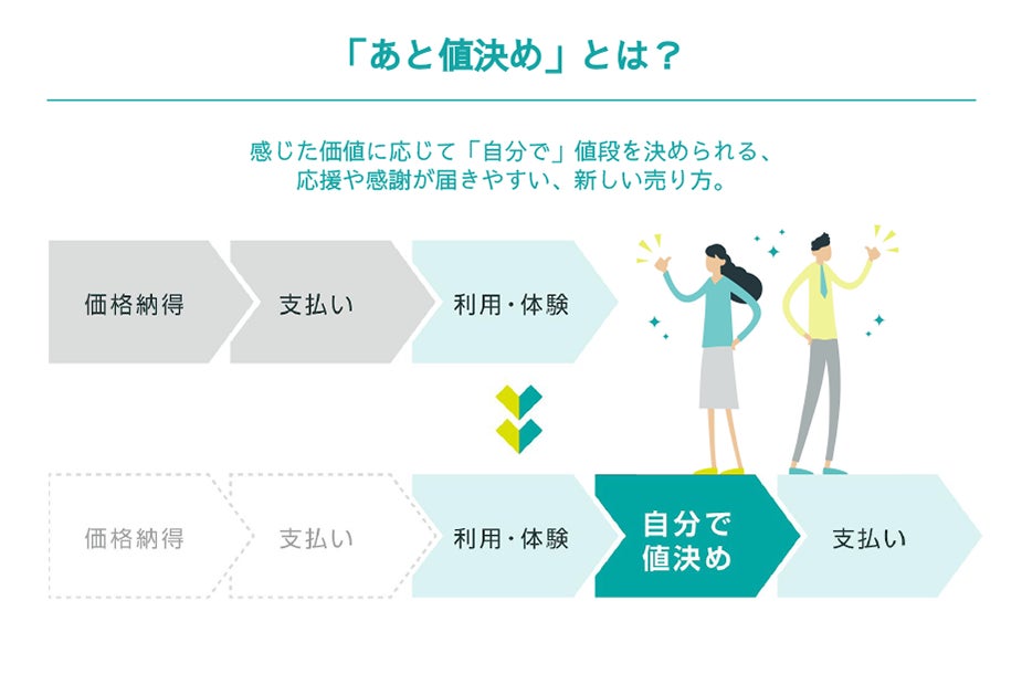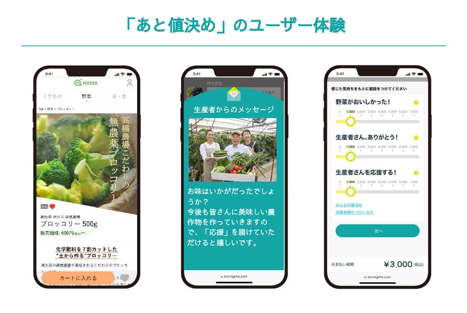 その仕組みを可能にしたのが当社の「あと値決め」というポストプライシングサービスです。あと値決めは、消費者が実際に体験した「あと」で自ら「値決め」を行うことができる仕組みで、実際にお食事頂いたあとの満足感や生産者への応援といった要素を、価格に取り込むことができます。