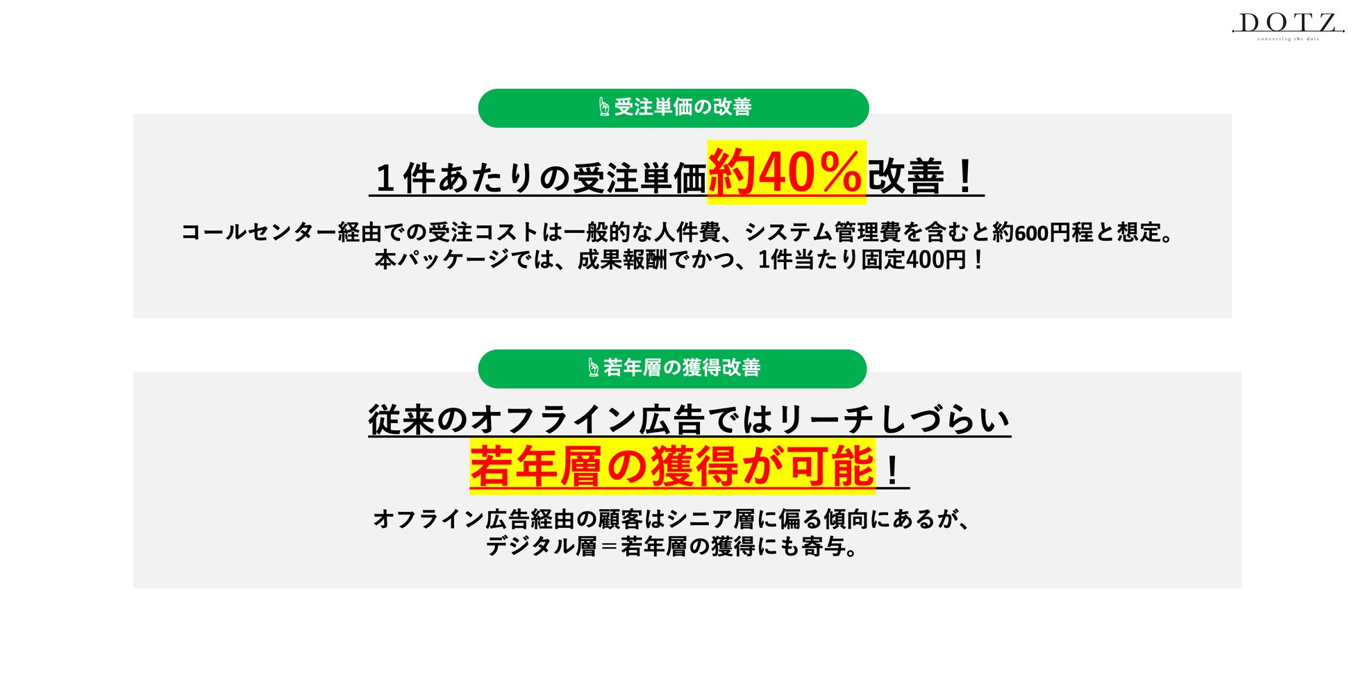 コールセンター経由での1件当たりの受注コストは一般的な人件費、システム管理費などを含めると1件あたり約600円程度とされています。それに対し、本サービスでは成果報酬かつ1件当たり400円の受注単価となり、約40%のコスト削減が実現できます。