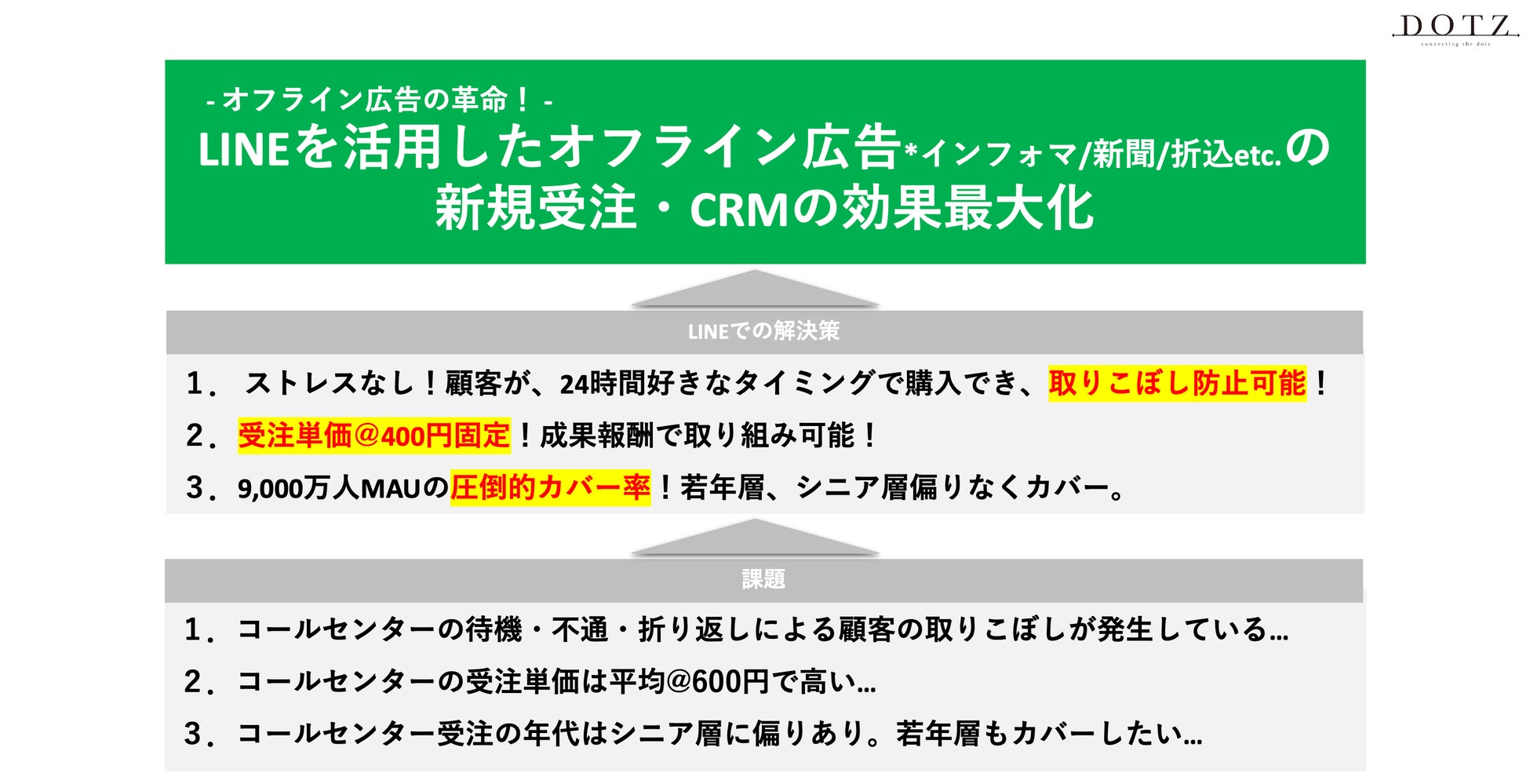 DX推進・マーケティング戦略カンパニーのDOTZ株式会社(本社:東京都渋谷区、代表取締役:稲益 仁)は、2022年9月6日より、コールセンターによる受注業務をLINEに置き換えることでオフライン広告の新規受注・CRMの効果を最大化できるサービス「チャットでかんたん!注文パッケージ」の提供を開始いたします。