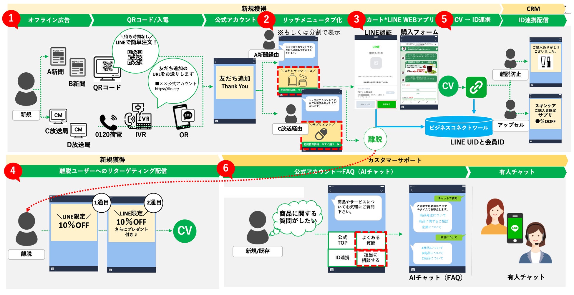 ①オフライン広告からLINE公式アカウントに誘導します。オフライン広告からQRコードにて読み込み、またはコールセンターへ荷電したユーザーを自動音声でLINE公式アカウントに誘導し、友だち追加を促します。