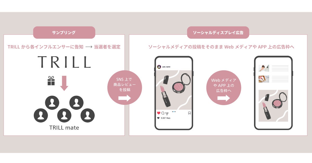 2022年6月よりTRILLは、美容・コスメ・ライフスタイルなど様々な領域のインフルエンサーを企業のマーケティング・広告に起用できる「TRILLインフルエンサーネットワーク」をリリースしました。大手芸能事務所からマイクロインフルエンサーまで幅広いタレントのを起用し、クライアントのマーケティング課題の解決を行っています。今回、「TRILLインフルエンサーネットワーク」と、ソーシャルメディアの投稿をそのまま広告クリエイティブに利用することができる「ソーシャルディスプレイ広告」を掛け合わせることで、ソーシャルメディアではリーチできないWebメディアやAPP上の広告枠へ配信が可能になります。